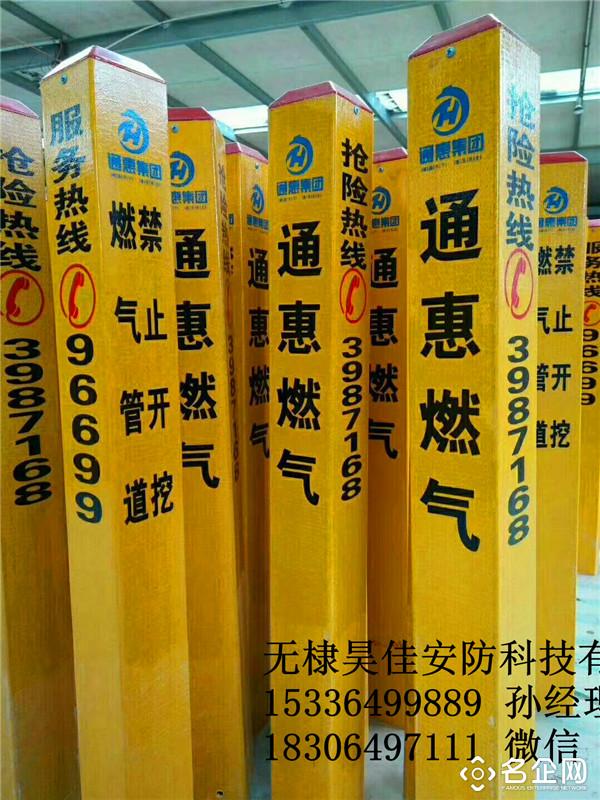 玻璃钢标志桩:经高温压制而成。抗冲击,耐磨损,耐高温,耐腐蚀,可以抗水、汽油、酒精、电解盐、醋酸、盐酸、钠钾化合物、尿、沥青,适合各种酸碱土壤。使用寿命长达30年。内容采用丝网印刷技术,警示效果好,不需要维护。重量轻,便于运输安装。无回收价值,自然防盗。
