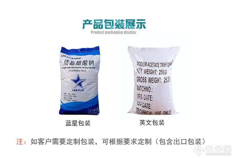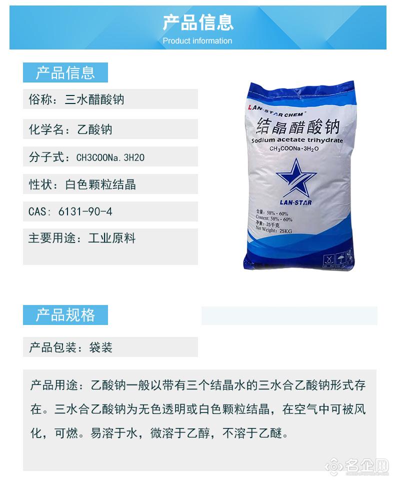 5、本品可用于碱性电镀锡的添加,但对镀层及电镀过程并无明显影响,不是必要成分。乙酸钠常用作缓冲剂,如用于酸性镀锌、碱性镀锡和化学镀镍。