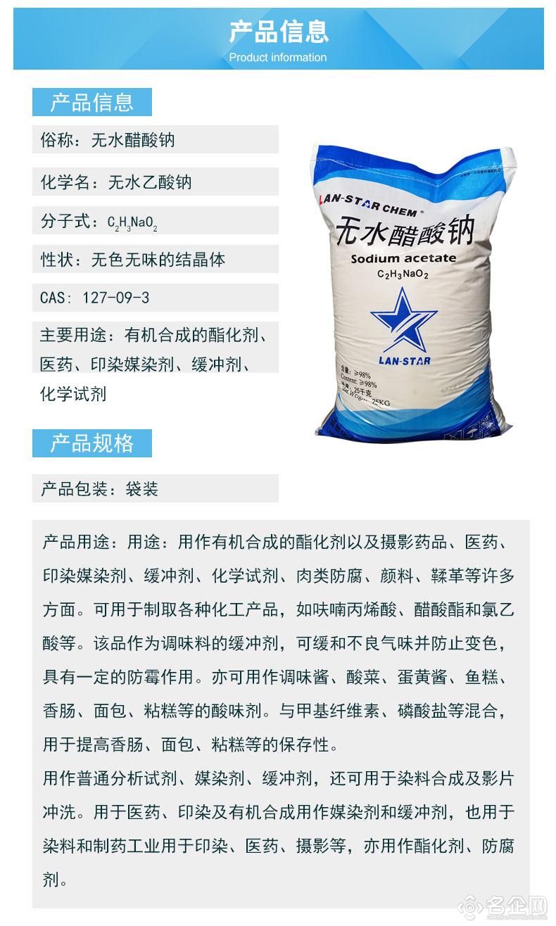 1、测定铅、锌、铝、铁、钴、锑、镍和锡。络合稳定剂。乙酰化作用的辅助剂、缓冲剂、干燥剂、媒染剂。
