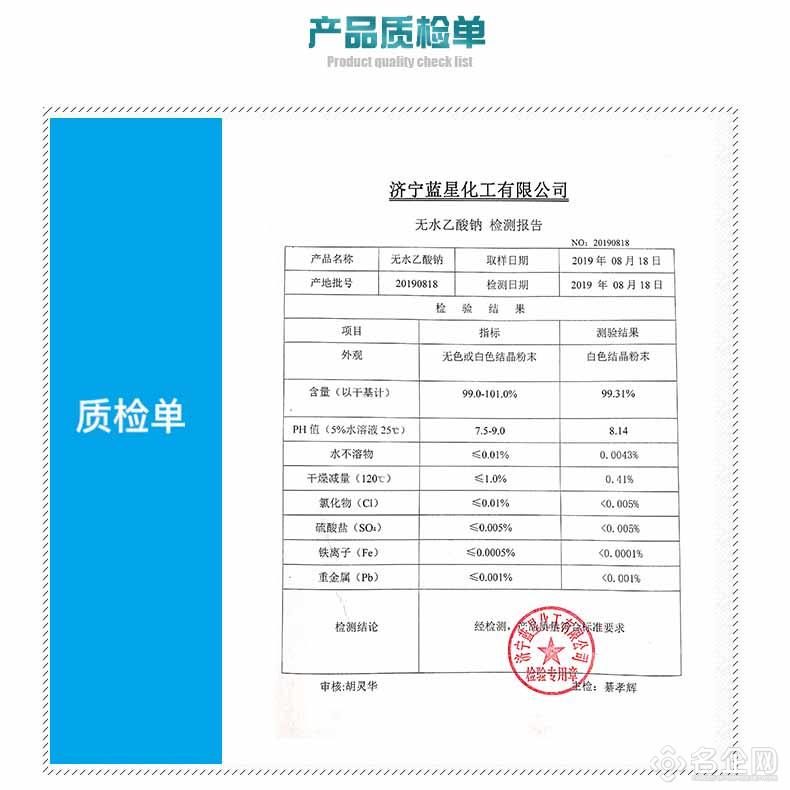 5、本品可用于碱性电镀锡的添加,但对镀层及电镀过程并无明显影响,不是必要成分。乙酸钠常用作缓冲剂,如用于酸性镀锌、碱性镀锡和化学镀镍。