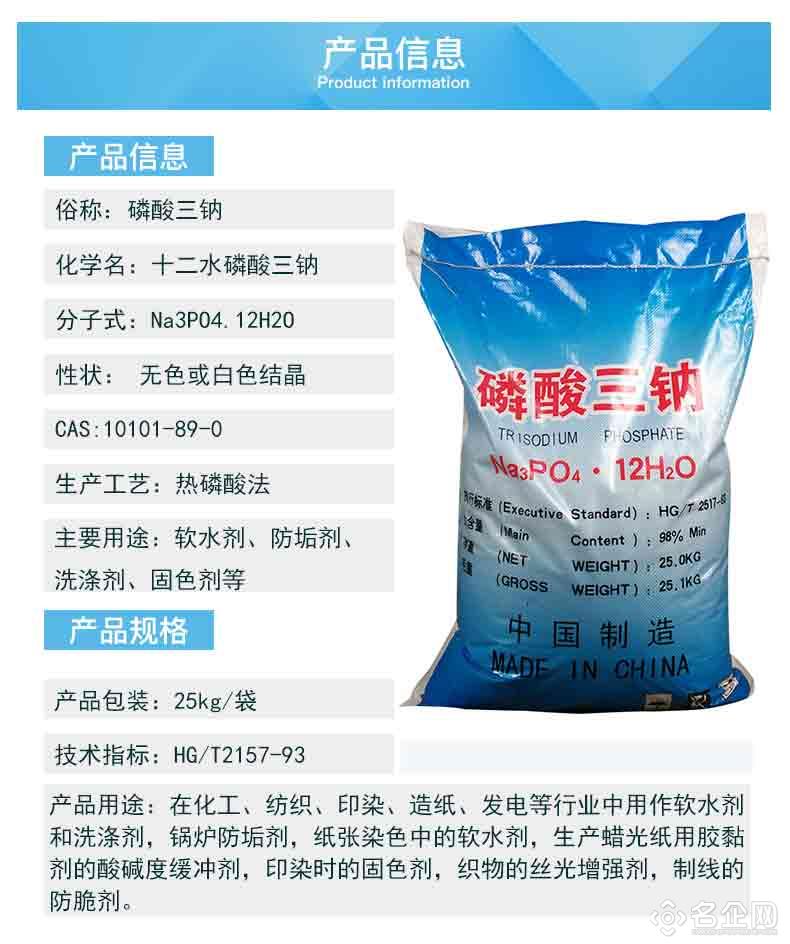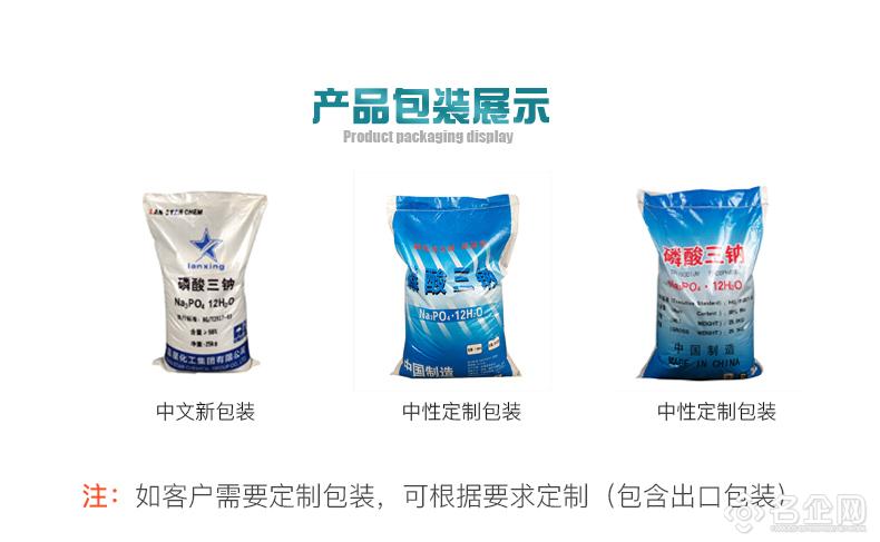 2、在化工、纺织、印染、造纸、发电等行业中用作软水剂和洗涤剂,锅炉防垢剂,纸张染色中的软水剂,生产蜡光纸用胶黏剂的酸碱度缓冲剂,印染时的固色剂,织物的丝光增强剂,制线的防脆剂。冶金工业用作化学去油、去污,用作照相显影溶液中的优良促进剂。牙齿清洁剂和瓶器的洗涤剂。橡胶乳汁的凝固剂。糖汁净化剂。磷酸盐在食品加工中起品质改良作用,例如在肉制品中有保持肉的持水性,增进结着力等作用,以减少肉中营养成分的损失并保存肉的柔嫩性。在食品加工中也用作乳化剂、营养增补剂、品质改良剂。是配制面食用碱水的原料,亦用于砂糖精制和α-淀粉的制造。还用作食品用瓶、罐等的洗涤剂。