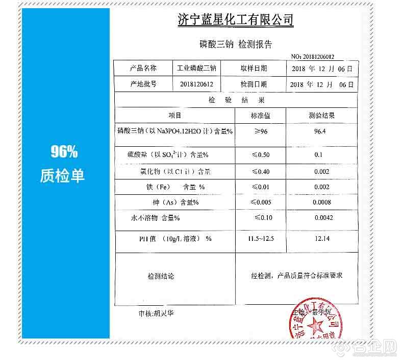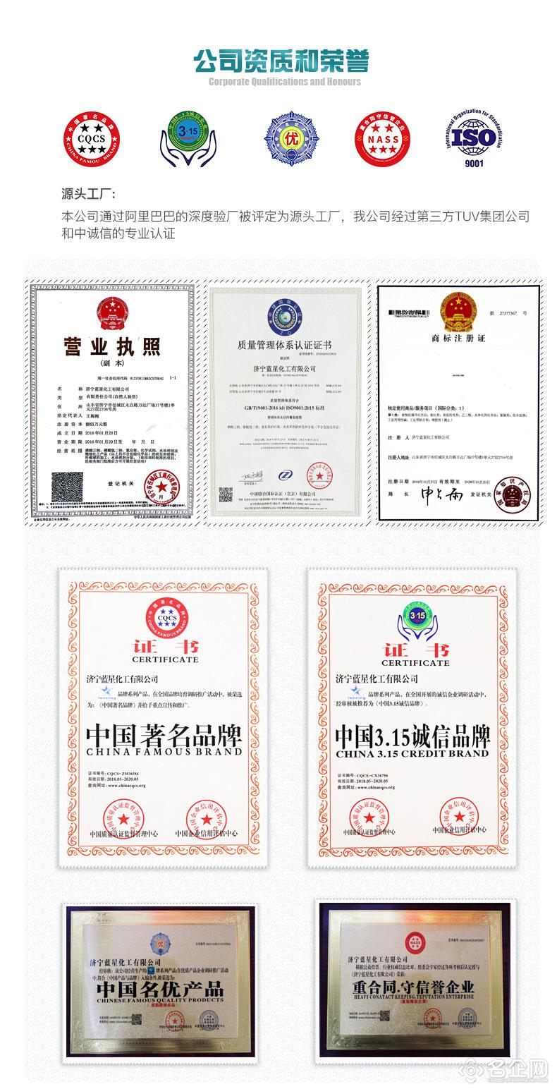 济宁蓝星化工有限公司,是从事研制、开发、生产磷酸三钠、磷酸氢二钠、氯化铵等水处理药剂及精细化工产品的专业厂家,始终以科技为先导以质量求生存,以信誉求发展,坚持优惠价格,优良服务为标准。不断开发出新产品。在广泛吸收国内外同类产品的基础上,结合不同水质精心研制生产,保证产品质量和性能在同行业中处于领先水平。广泛用于冶金、电力、化工、造纸、石油、自来水等行业的工业水处理和城镇给排水的应用,产品畅销全国二十几个省市、城镇,深受新老用户好评。我们拥有完整、科学的质量管理体系。公司的诚信、实力和产品质量获得业界的认可。公司一贯以“合理的价格”、“高质量的产品”、“准时的交货期”、“良好的信誉服务”为基本准则。本公司期待成为你忠实的朋友和合作伙伴,共创互惠双赢的未来,欢迎来电洽谈业务!主要产品有:磷酸盐系列:磷酸三钠、磷酸氢二钠、磷酸二氢钾、三聚磷酸钠、六偏磷酸钠;氯化物系列:氯化铵、氯化钙、聚合氯化铝;活性炭系列:椰壳活性炭、果壳活性炭、煤质活性炭、粉状活性炭等几十种水处理产品,欢迎新老客户前来选购!