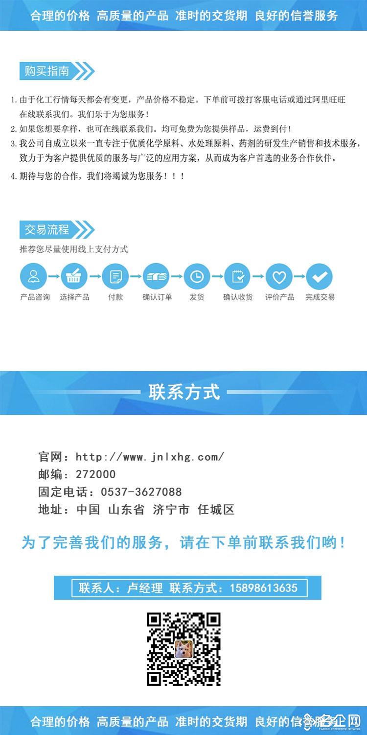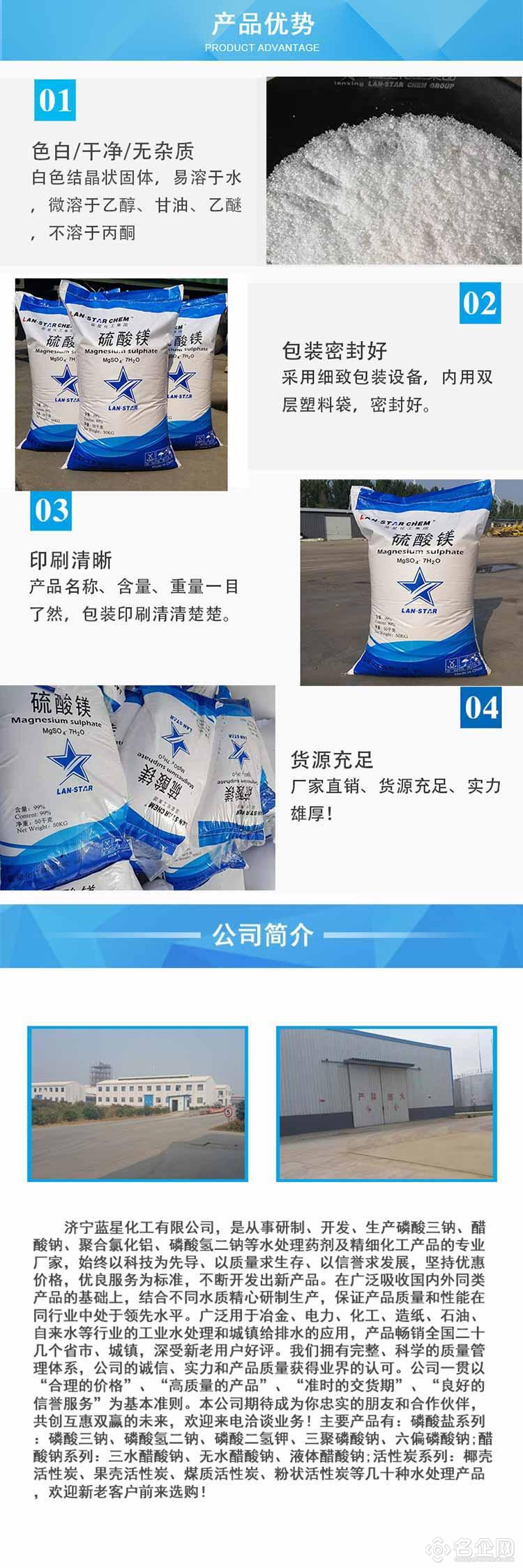 济宁蓝星化工有限公司,是从事研制、开发、生产磷酸三钠、醋酸钠、聚合氯化铝、硫代硫酸钠、硫酸镁、硫酸亚铁、磷酸氢二钠等水处理药剂及精细化工产品的专业厂家,始终以科技为先导、以质量求生存、以信誉求发展,坚持优惠价格,优良服务为标准,不断开发出新产品。在广泛吸收国内外同类产品的基础上,结合不同水质精心研制生产,保证产品质量和性能在同行业中处于领先水平。广泛用于冶金、电力、化工、造纸、石油、自来水等行业的工业水处理和城镇给排水的应用,产品畅销全国二十几个省市、城镇,深受新老用户好评。我们拥有完整、科学的质量管理体系,公司的诚信、实力和产品质量获得业界的认可。公司一贯以“合理的价格”、“高质量的产品”、“准时的交货期”、“良好的信誉服务”为基本准则。本公司期待成为你忠实的朋友和合作伙伴,共创互惠双赢的未来,欢迎来电洽谈业务!主要产品有:磷酸盐系列:磷酸三钠、磷酸氢二钠、磷酸二氢钾、三聚磷酸钠、六偏磷酸钠;醋酸钠系列:三水醋酸钠、无水醋酸钠、液体醋酸钠;磷酸盐系列:硫酸镁、硫酸亚铁、硫代硫酸钠;活性炭系列:椰壳活性炭、果壳活性炭、煤质活性炭、粉状活性炭等几十种水处理产品,欢迎新老客户前来选购!