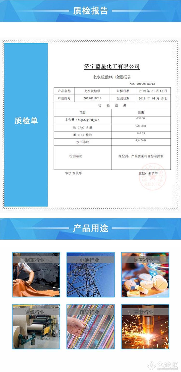 五,医药上用作泻剂。也用于制革、***、肥料、造纸、瓷器、印染料等工业。
