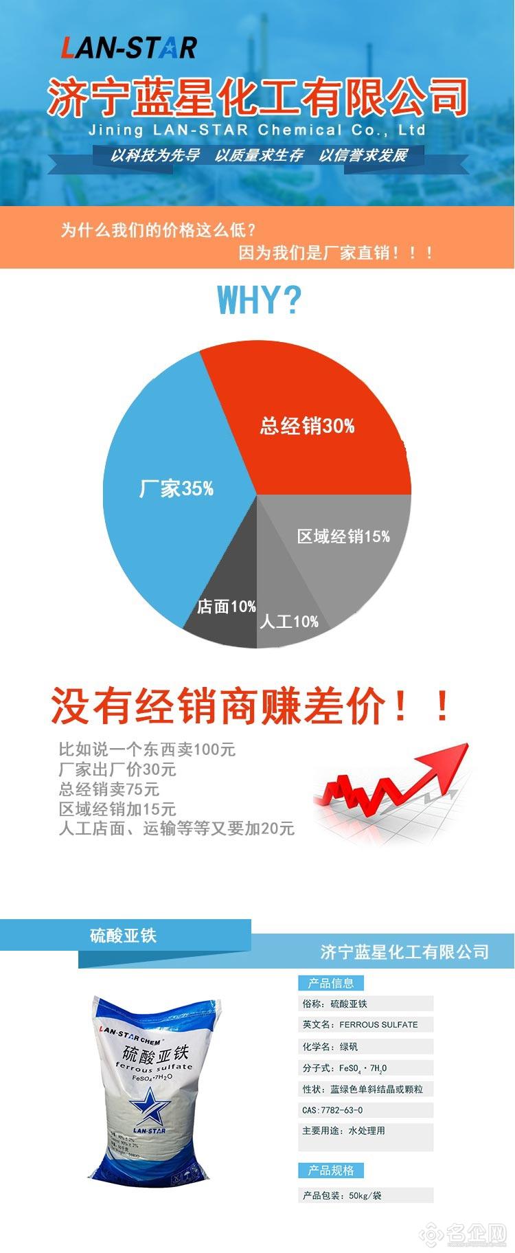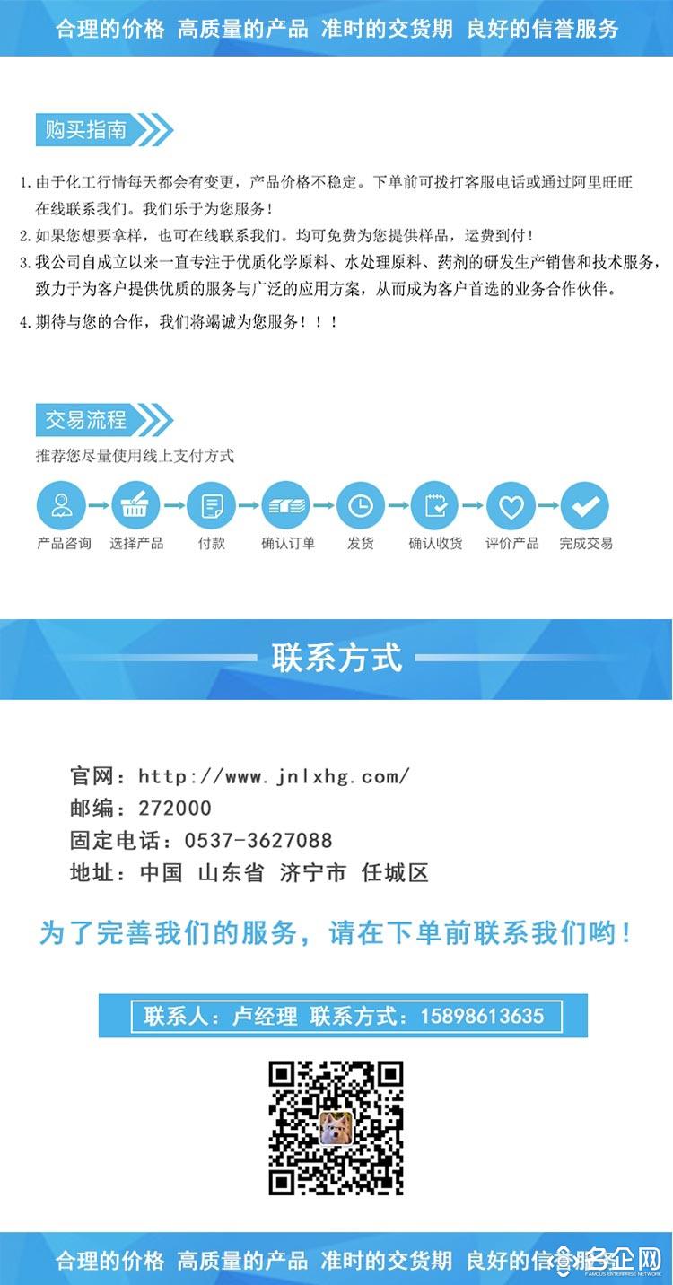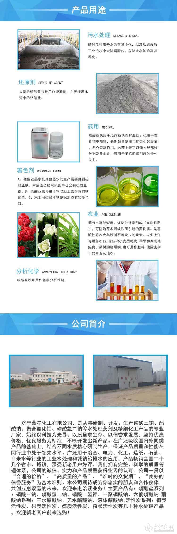 济宁蓝星化工有限公司,是从事研制、开发、生产磷酸三钠、醋酸钠、聚合氯化铝、硫代硫酸钠、硫酸镁、硫酸亚铁、磷酸氢二钠等水处理药剂及精细化工产品的专业厂家,始终以科技为先导、以质量求生存、以信誉求发展,坚持优惠价格,优良服务为标准,不断开发出新产品。在广泛吸收国内外同类产品的基础上,结合不同水质精心研制生产,保证产品质量和性能在同行业中处于领先水平。广泛用于冶金、电力、化工、造纸、石油、自来水等行业的工业水处理和城镇给排水的应用,产品畅销全国二十几个省市、城镇,深受新老用户好评。我们拥有完整、科学的质量管理体系,公司的诚信、实力和产品质量获得业界的认可。公司一贯以“合理的价格”、“高质量的产品”、“准时的交货期”、“良好的信誉服务”为基本准则。本公司期待成为你忠实的朋友和合作伙伴,共创互惠双赢的未来,欢迎来电洽谈业务!主要产品有:磷酸盐系列:磷酸三钠、磷酸氢二钠、磷酸二氢钾、三聚磷酸钠、六偏磷酸钠;醋酸钠系列:三水醋酸钠、无水醋酸钠、液体醋酸钠;磷酸盐系列:硫酸镁、硫酸亚铁、硫代硫酸钠;活性炭系列:椰壳活性炭、果壳活性炭、煤质活性炭、粉状活性炭等几十种水处理产品,欢迎新老客户前来选购!