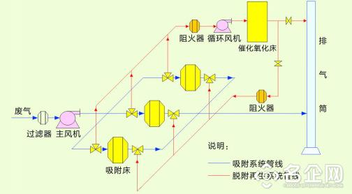 2)经过活性炭吸附工艺的活性炭在温度变化后,有机废气中的有机物从活性炭中气化解析出来,在风机负压引导下有机物通过脱附管道进入催化燃烧床再次升温并与填装在催化燃烧床内部的贵金属催化剂发生化学反应,有机物得到二次分解净化。
