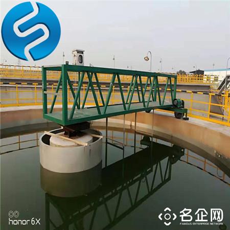污水从池中心的进水管经导流筒扩散后,均匀地向周边呈辐射状流出,呈悬浮状的污泥经沉淀后沉积于池底,上清液通过溢流堰板由出水槽排出池外,污泥刮板由池周刮向中心集泥槽,依靠池内水压通过排泥管排出池外。主梁在周边驱动装置的带动下,以中心旋转支座为轴心沿池顶以2.0m/min线速度行驶,主梁下部连接支架、污泥刮泥板等。近液面处设置浮渣刮板,沿中心稳流筒延伸至铰链式刮渣耙,当主梁旋转时,浮渣刮板将液面的浮渣由池中心撇向池周,收集在铰链式刮渣耙区内,收集的浮渣随主机在池周运动至撇渣斗,通过刮渣耙的铰链活动刮至撇渣斗内,排至池外。