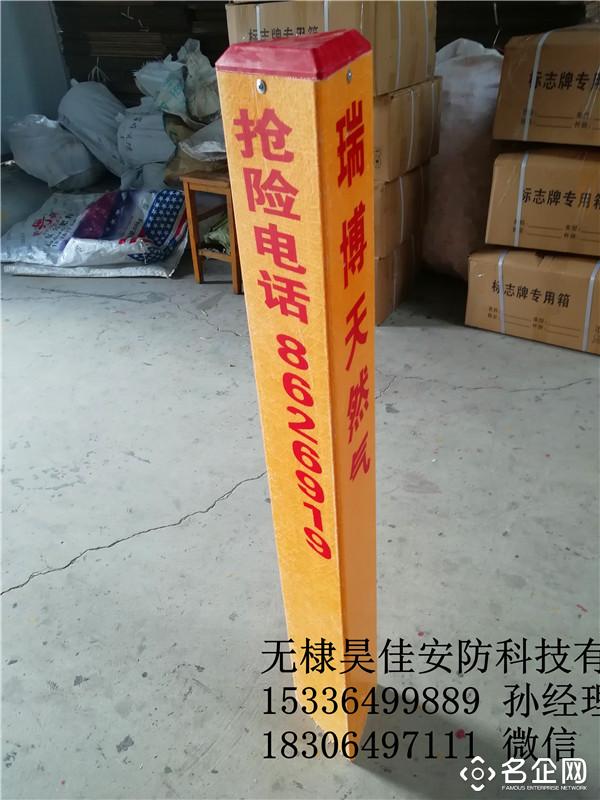 玻璃钢标志桩:经高温压制而成。抗冲击,耐磨损,耐高温,耐腐蚀,可以抗水、汽油、酒精、电解盐、醋酸、盐酸、钠钾化合物、尿、沥青,适合各种酸碱土壤。使用寿命长达30年。内容采用丝网印刷技术,警示效果好,不需要维护。重量轻,便于运输安装。无回收价值,自然防盗。