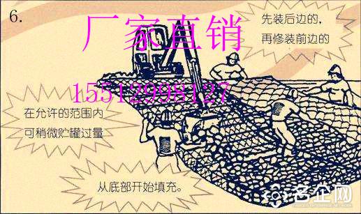 2 相邻单元网箱的上下框线或折线,必须采用绑扎丝连接;3 相邻单元网箱的网片结合面每平米绑扎2处;4 有下层网箱的,放置、绑扎上层网箱时,必须与下方网箱面层框线或网片绑扎、连成一体;裸露部位的网箱,必须设置水平固定丝,水平固定丝在每层石料填放、铺平后设置。水平固定丝可以分为两种。一种是八字形拉筋,即水平及垂直间距为25cm~35cm,呈八字形向内与边网片或临土面连结并拉紧固定。另一种为前后面对拉筋,拉筋可以呈双股8字型(一般用在挡墙),也可为单根拉筋(一般用在单层护脚)。