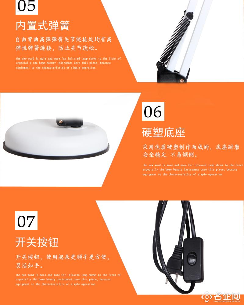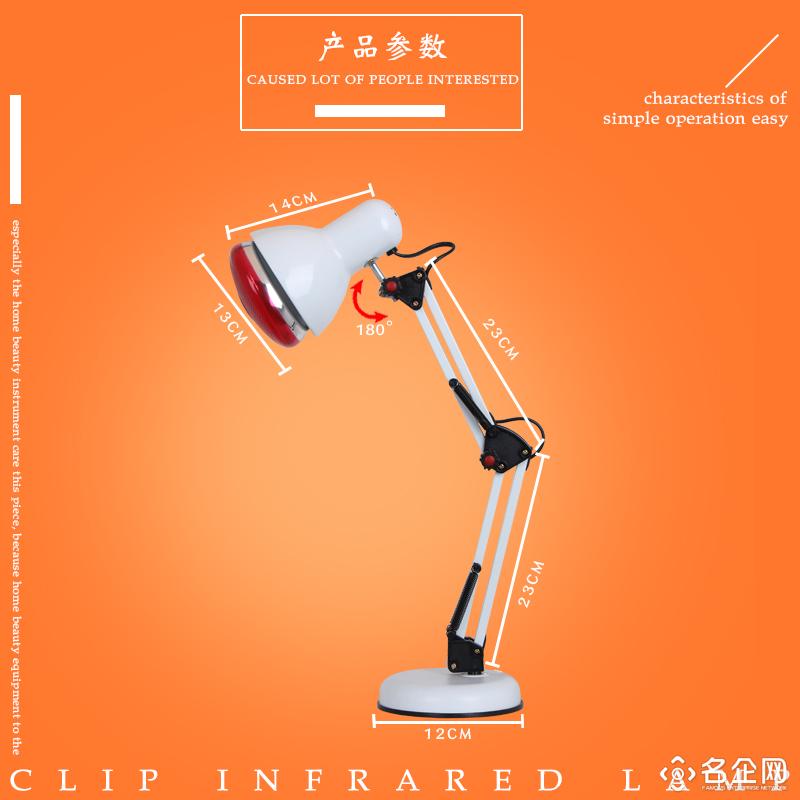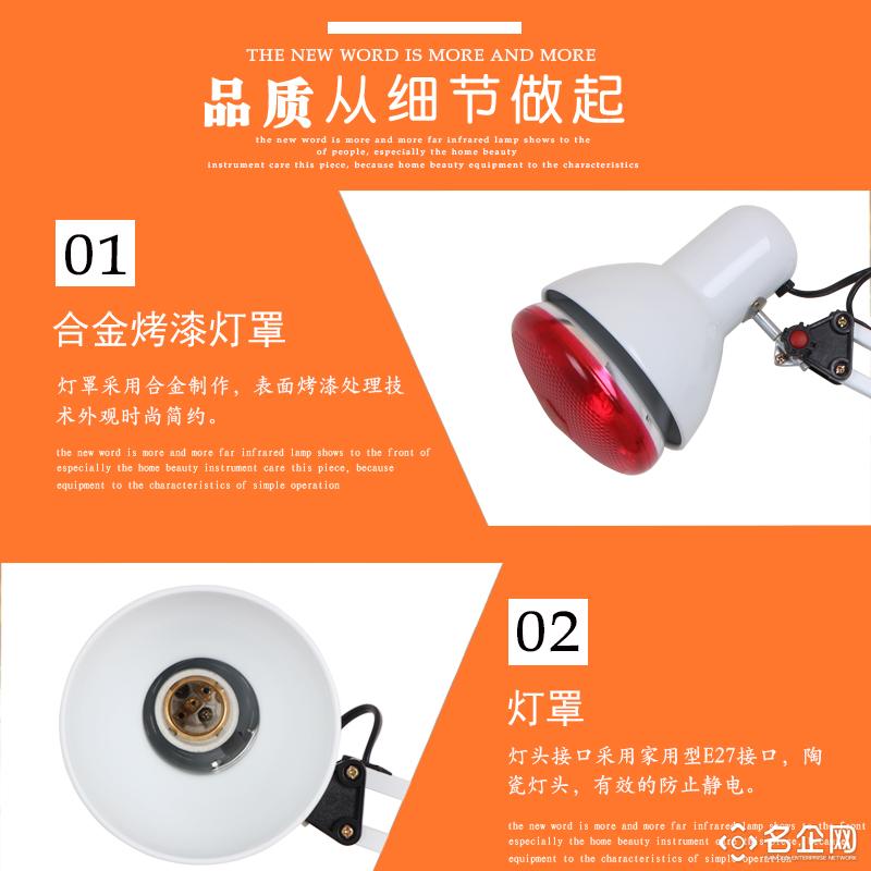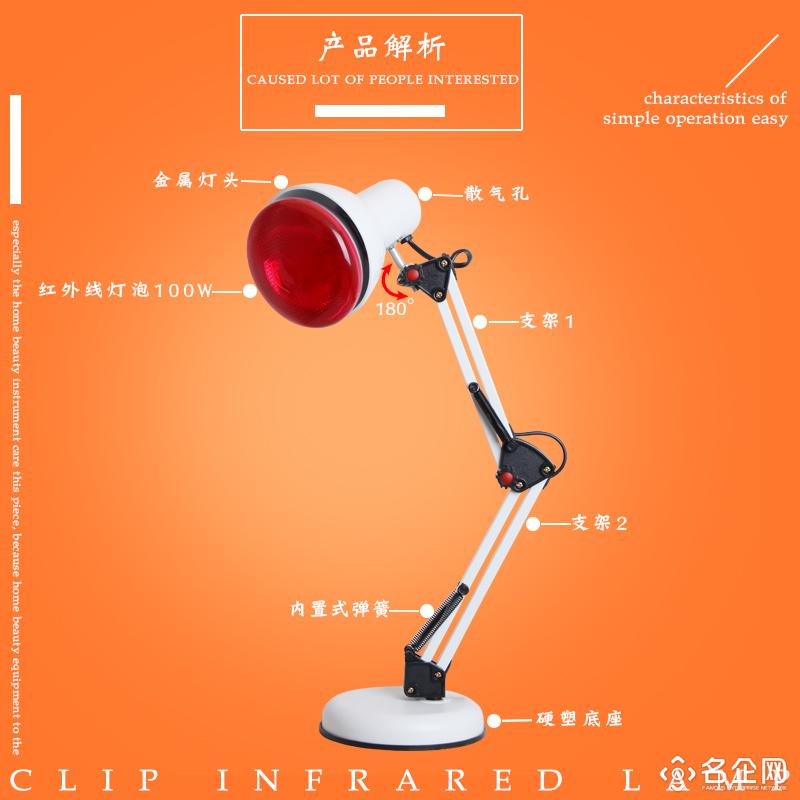 远红外烤灯:辐射频率高,渗透性强,用于局部的红外线辐射,能加速血液循环,改善新陈代谢,消炎杀菌,加速伤口愈合。同时对风湿性关节炎等有较好的疗效。